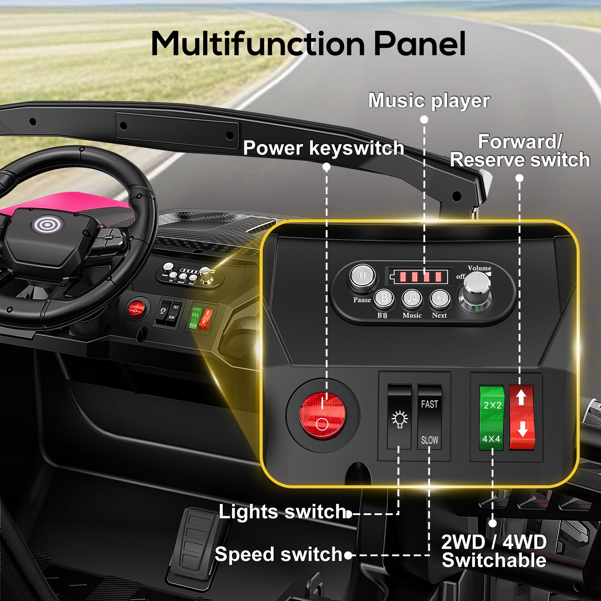 Various simulation designs for our big kid ride on can simulate the most realistic driving experience, allowing children to experience the joy of driving. The clear operation panel is suitable for children of all ages to operate. Not only does it have built-in music, but it can also connect children's favorite songs and audio through Bluetooth and USB. The horn can produce the real sound of a car starting, and the LED lights and foot pedals can immerse your child in the joy of driving.